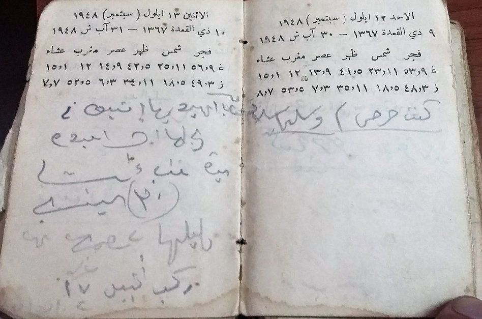 تبدأ قصّتنا مع مفكّرة المرحوم الحاجّ علي حمدان مصلح من بلدة الزاوية، الّتي استخدمها لتوثيق يوميّاته بدءًا من عام 1938 إلى مطلع السبعينات. يروي الحاجّ علي الكثير من التفاصيل الدقيقة حول الزراعة والعمل اليوميّ، ويلوّن ذلك ببعض التفاصيل حول مشاركته في معارك عام 1948؛ فقد شارك في الحرس القرويّ للدفاع عن بلدته، جنبًا إلى جنب مع كتائب الجيش العراقيّ الّتي حاربت في فلسطين. يروي الكثير من أهل الزاوية والقرى المجاورة، قصصًا عن بطولات الجيش العراقيّ في الحرب، ويُبدون إعجابًا كبيرًا بدقّة مدافعه وقدرتها الكبيرة على تدمير الأهداف، وقد يكون حديثهم هذا ممزوجًا بطيف من الأسطورة، وكأنّهم يستنجدون بجيش عراقيّ قويّ من الماضي، لعلّه يغيّر في موازين قوى الحاضر.