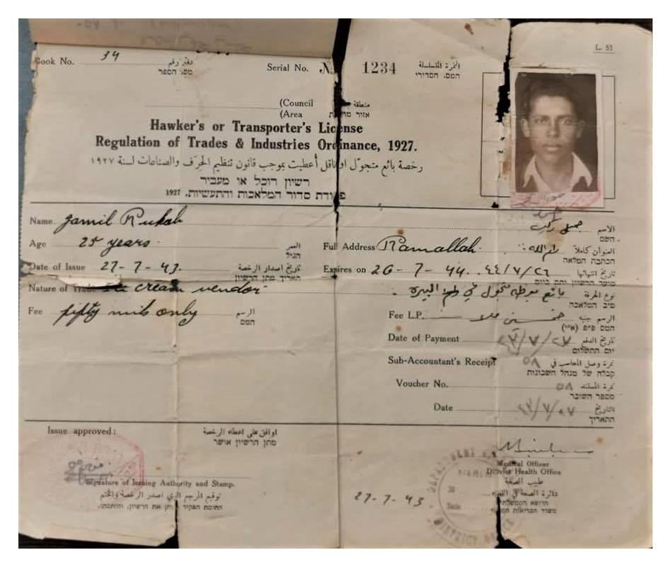 رخصة بائع متجوّل لجميل ركب، موقّعة عام 1943